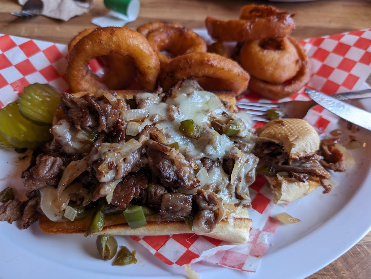 What a gem! Sarah was awesome, the food wonderful, and the vibe super chill. I had onion rings with the best Ruben ever, my daugher had grenchili potato appetizer ( i dont recall what the name of it was sorry), and the hubby had philly cheese steak sandwich. So much food we had to take a to go box. forgot to take pictures before we started eating and there was only one onion ring left when the rest of the food arrived.